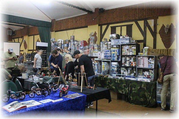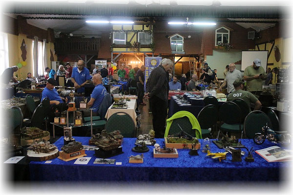 Bei unserem Eintreffen waren schon alle Tische dabei, mit Modellen verziert zu werden. Die Organisation durch die Kollegen vom PMC wie immer gut. Der Löwe bot die Gastronomie, kalte Getränke oder Kaffee gab es auch oben im Saal. Einige Händler aus dem Nachbarland, Lars vom HSC, sowie Airbrushtechnik von Gabbert und Theiß rundeten das Rahmenprogramm ab.
