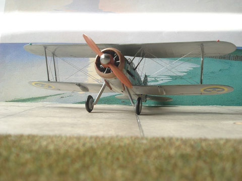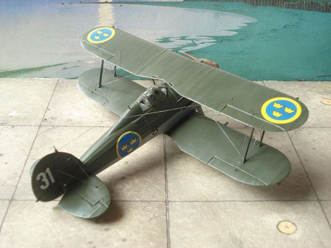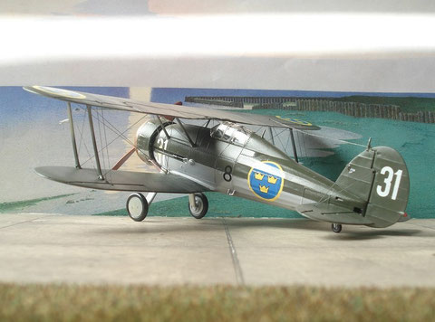 Die Gloster Gladiator kamen in der zweiten Hälfte der dreissiger Jahre zur Flygvapnet. Sie flogen in der F (Flottilij ) 8 in Barcaby. Das dargestellte Modell ist die Flygvapnet Nr. 261 Kennzeichen 8 31 und wurde am 20.4.1939 in Dienst gestellt. Sie absolvierte 696 Flugstunden bis zur Ausserdienststellung am 16.6.1945.
