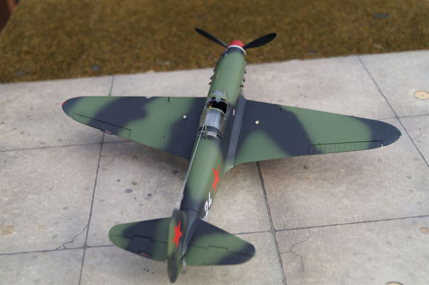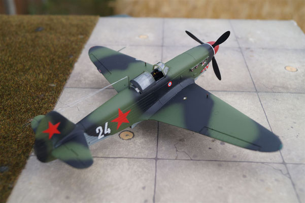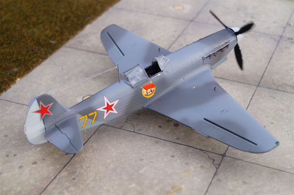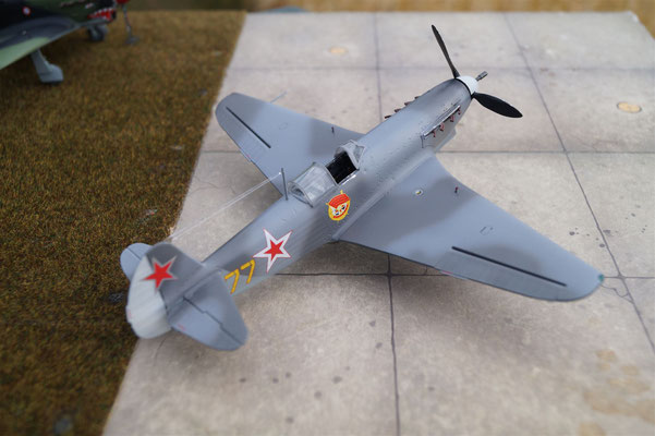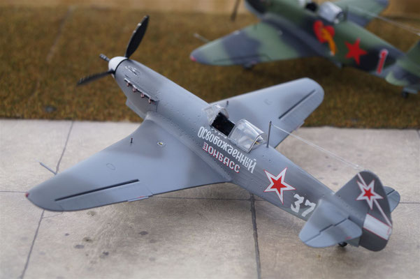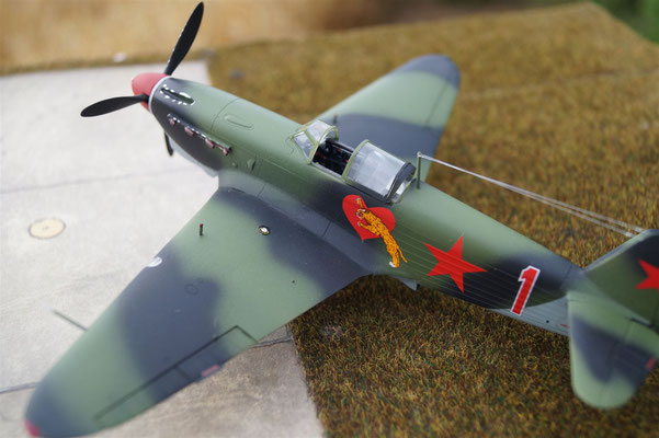 Insgesamt fällt die Detaillierung gegenüber dem Edurad-Modell etwas ab, die frühen ICM Abziehbilder sind unbrauchbar. Hier machte sich die Restekiste für die 2 dargestellten Maschinen bezahlt. Das etwas wenig detailreiche Cockpit wurde mit den Fotoätzteilen der Jak-1 angereichert. Das Modell war in einem Kasten mit den wunderbaren Figuren, Piloten und Mechaniker von ICM.