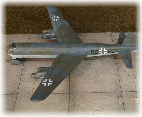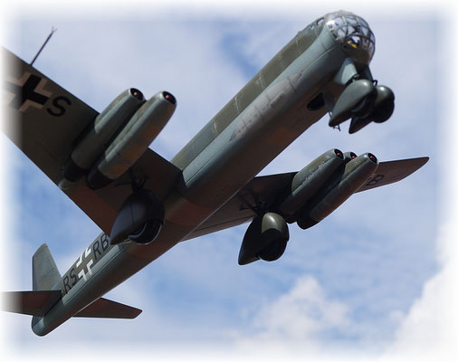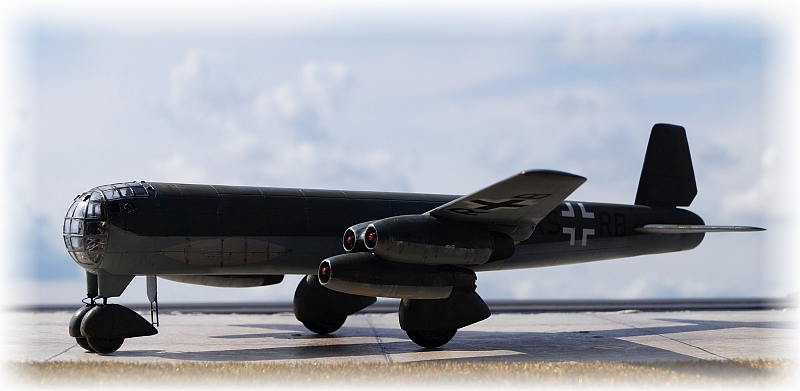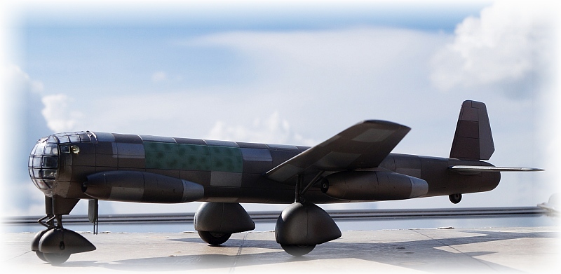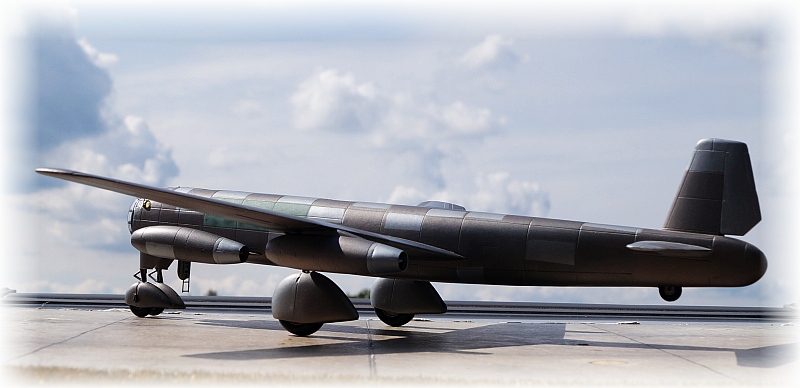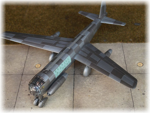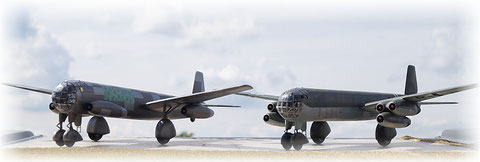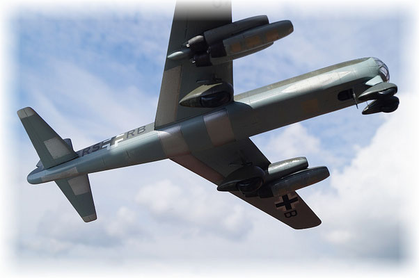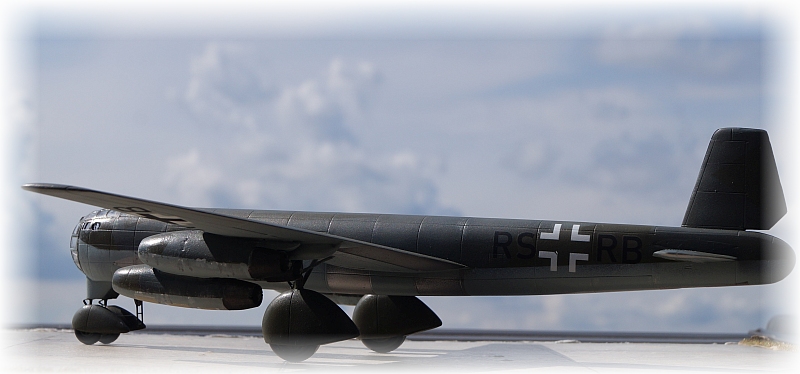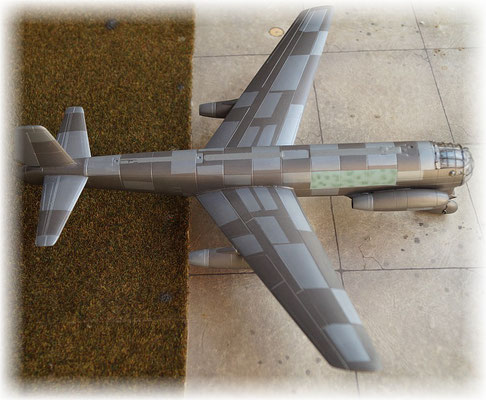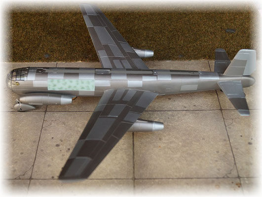 Für die Ju 287 V2 hat Detlef Schorsch von Classic Plane die TL Drillingsgondeln als Zu-Rüstsatz entwickelt. Für den Umbau ist aber auch die Position des Höhenleitwerkes nach unten zu verändern wie im Original. Das hatten Strömungsmessungen an der V1 ergeben. Der Umbau bringt erhebliche Anpassungs-Arbeiten mit sich, auch an Ballast ist trotz der Resingondeln zu denken. Der Umbau ist wegen der vielen Stachtelarbeiten und dem fogenden Verschleifen der Resinteile kein Spaziergang. Ich habe die Maschine so wie in Brandis 1945 aufgefunden, lackiert.