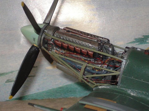 Das ICM Modell überraschte durch das Vorhandesein eines gut detaillierten Triebwerkes. Ich habe dieses mit diversen Leitungen und Schläuchen nach Vorbildfotos noch aufgewertet.Auch die Waffenschächte habe ich geöffnet dargestellt. Dadurch wurde der an sich recht passgerechte Bau, doch etwas umfangreicher. Lediglich die spröden, brösiligen Abziehbilder wussten nicht zu überzeugen.