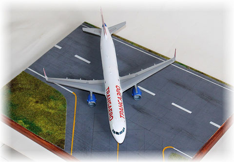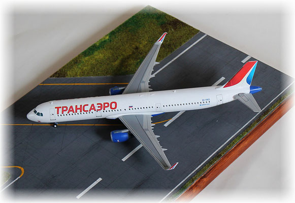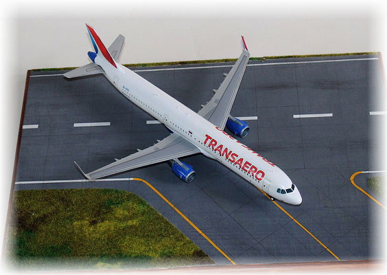 Die Transaero wurde 1991 in Russland gegründet und entwickelte sich zur zweitgrößten Fluggesellschaft des Landes.Sie geriet in finanzielle Schwierigkeiten und stellte den Flugbetrieb im Oktober 2015 ein. Im Sommer dieses Jahres konnte ich viele Maschinen dieses Airline fotografieren, unter anderen auch die beiden neu gelieferten A 321 die sich in einer neuen Bemalung präsentierten die bei allen Flugzeugen zur Anwendung kommen sollte. Eine der beiden stellt mein Modell dar.